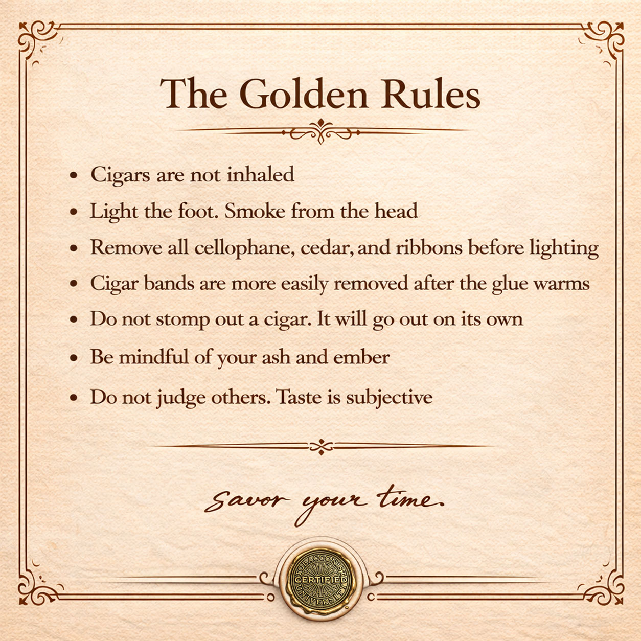 We saw this graphic the other day and thought it was appropriate to post here so that you could read it and take note of it. There are no rules specifically to cigar smoking but these are good suggestions and so many are first starting out with cigars they don’t know the basics and we’re more than happy to show you the basics based on our experience and the experience of our customers who have more experience than we do.